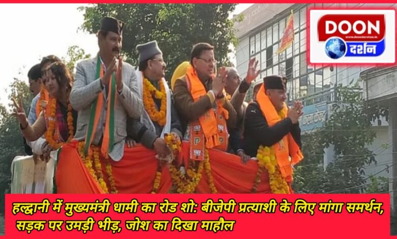 हल्द्वानी में मुख्यमंत्री धामी का रोड शो: बीजेपी प्रत्याशी के लिए मांगा समर्थन, सड़क पर उमड़ी भीड़, जोश का दिखा माहौल