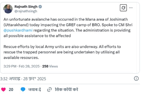 रक्षामंत्री राजनाथ सिंह ने जोशीमठ के माणा क्षेत्र में हुए दुर्भाग्यपूर्ण हिमस्खलन के बारे में बयान दिया। उन्होंने कहा, “आज माणा क्षेत्र में बीआरओ के जीआरईएफ शिविर पर हिमस्खलन का प्रभाव पड़ा है। इस स्थिति के बारे में मैंने मुख्यमंत्री पुष्कर सिंह धामी से बात की है। प्रशासन पूरी तरह से प्रभावितों को हर संभव सहायता प्रदान कर रहा है। साथ ही, स्थानीय सेना इकाइयाँ बचाव कार्य में जुटी हुई हैं। हम सभी उपलब्ध संसाधनों का उपयोग करके फंसे हुए कर्मियों को बचाने के लिए हर संभव प्रयास कर रहे हैं।”