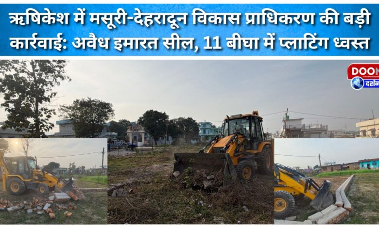ऋषिकेश में मसूरी-देहरादून विकास प्राधिकरण की बड़ी कार्रवाई: अवैध इमारत सील, 11 बीघा में प्लाटिंग ध्वस्त