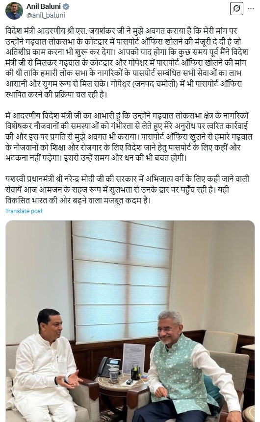 सांसद ने बताया कि विदेश मंत्री एस. जयशंकर ने उन्हें सूचित किया कि उनकी मांग पर गढ़वाल के कोटद्वार में पासपोर्ट ऑफिस खोलने की मंजूरी मिल गई है, और यह ऑफिस जल्द ही कार्य करना भी शुरू कर देगा।