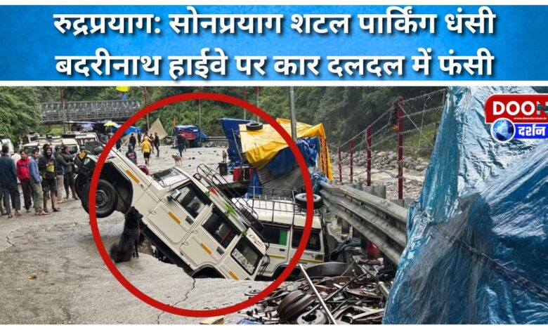 रुद्रप्रयाग: सोनप्रयाग शटल पार्किंग धंसी, बदरीनाथ हाईवे पर कार दलदल में फंसी