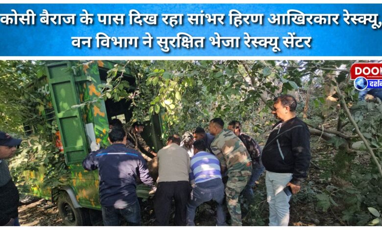 कोसी बैराज के पास दिख रहा सांभर हिरण आखिरकार रेस्क्यू, वन विभाग ने सुरक्षित भेजा रेस्क्यू सेंटर