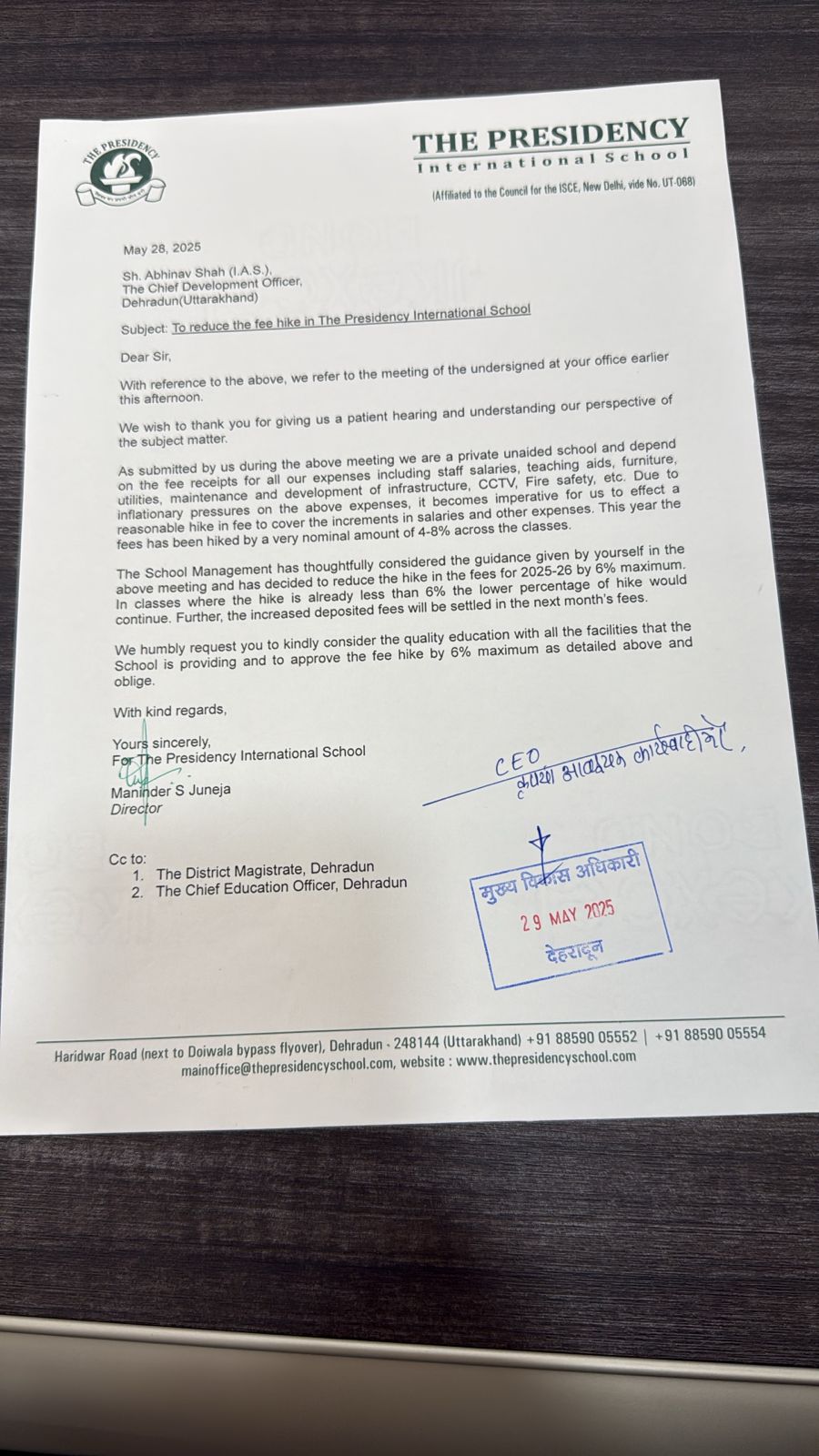 मुख्यमंत्री के निर्देश पर जिला प्रशासन का शिक्षा माफियाओं पर प्रहार जारी द प्रेसिडेंसी इंटरनेशनल स्कूल, भनियावाला ने दी फीस घटाने की लिखित सूचना