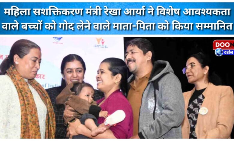 महिला सशक्तिकरण एवं बाल विकास मंत्री रेखा आर्या ने आज शुक्रवार को दत्तक ग्रहण माह के अवसर पर विशेष आवश्यकता वाले बच्चों को गोद लेने वाले माता-पिताओं को सम्मानित भी किया। यह कार्यक्रम संस्कृति विभाग के सभागार में ही आयोजित किया गया।
